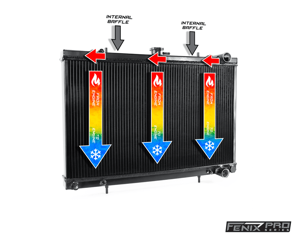 Upgrade your old, stock radiator with a Fenix Performance Nissan alloy radiator. Designed with performance and reliability in mind, we find the weak points of OEM radiators and eliminate them, while offering a factory fit and an increased cooling efficiency of up to 30%.