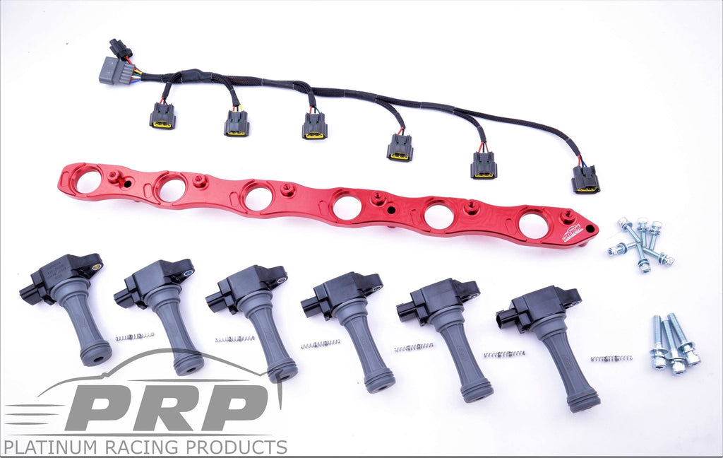 Key Features: * Billet Alloy anodized bracket is engineered to fit all ignition coils in a way that allows user-friendly access to all the coil plugs and spark plugs in a non-invasive manner. * Kit now includes custom height quality one-piece silicone injected spark plug stalks that seal the spark plug well, avoiding water pooling and inherent engine misfires. * Custom made springs already fitted inside the stalks make for extremely fast installation as well as no trimming of springs required. * Coil kit fits well under the valley cover without ANY modification. * Bench tested, club motorsport grade branded harness, high temp Tefzel wire and crimp joins used with OEM connectors and glue lined heat-shrink * Now clears HKS VCAM * Genuine OEM Hitachi coils are rated to 2600 hp and come with a 1-year warranty. * Bolt kit included caters for the 6 ignition coils and billet bracket to head. * Standard colours are now Black, Purple, Red, Silver, Blue with custom order colours Gold, Teal, Green, Teal, Orange, Grey. * Lifetime warranty on all PRP products.